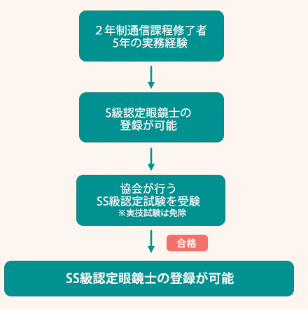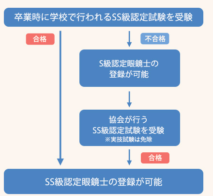 平成19年4月1日以降は、認定眼鏡士の対象は原則として3年制以上の眼鏡学校卒業生のみとしていますが、公益社団法人日本眼鏡技術者協会は一般の眼鏡技術者に認定眼鏡士への道を開くため、年1回SS級の認定試験を行っています。